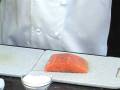 1) Season salmon with salt and pepper. 2) Sprinkle flour and cover one side. 3) Press on thyme 4) Fry the salmon unti...